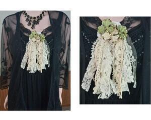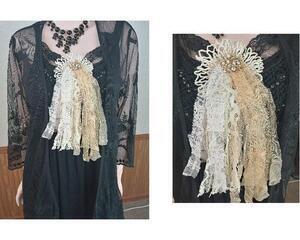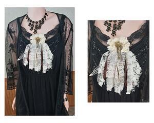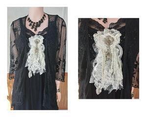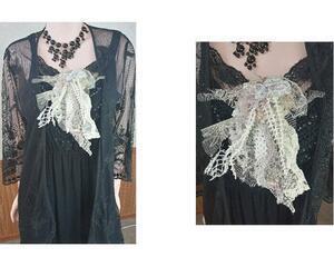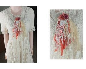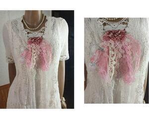 The tatters come away from around the waist and are made from multiple fabrics and the same as the wedding dress. Vintage inspired with sequins on the bodice with soft, dusky pink, antique looking ivory lace fabrics.